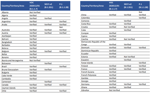 Endişe verici varyantların (VOC'ler) ve faydalı varyantların (VOI'ler) arka planı hakkında daha fazla bilgi, Haftalık Epidemiyolojik Güncellemenin daha önce yayınlanmış baskılarında mevcuttur. Burada, 30 Mart 2021 itibariyle DSÖ tarafından VOC olarak sınıflandırılan üç varyantın coğrafi dağılımına ilişkin kısa bir güncelleme ve ortaya çıkan VOI'ler hakkında bir güncelleme sunulmaktadır.