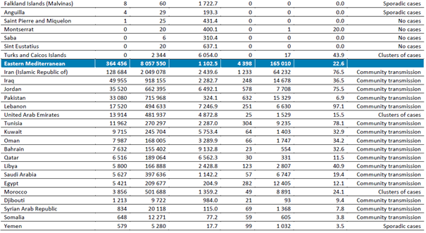En çok yeni ölüm vakası bildiren ülkeler; İran (1233 yeni ölüm, 100.000 kişi başına 1,5 yeni ölüm,% 78 artış), Pakistan (632 yeni ölüm, 100.000'de 0,3 yeni ölüm, %17 artış ) ve Ürdün (578 yeni ölüm, 100.000'de 5,7 yeni ölüm,% 12 azalma) olmuştur.