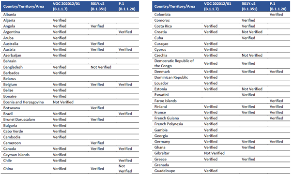 VOC bildiren ülke sayısı artmaya devam etmektedir (Tablo 2, Şekil 3, 4 ve 6, Ek 2). Bu bilgiler, sekanslama kapasitesindeki ülkeler arasındaki farklılıklar ve sekanslama için hangi numunelerin önceliklendirildiği dahil, ancak bunlarla sınırlı olmamak üzere, devam eden sürveyansın sınırlamaları dikkate alınarak yorumlanmalıdır. DSÖ, gözetim ve sekanslama kapasitesinin güçlendirilmesi ve SARS-CoV-2 varyantlarının bulaşma kapsamının temsili bir göstergesini sağlamak için sistematik bir yaklaşım savunmaya devam etmektedir; yerel epidemiyolojik duruma ve kapasiteye ve olağandışı olayların tespitine dayanır.