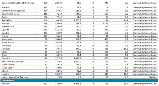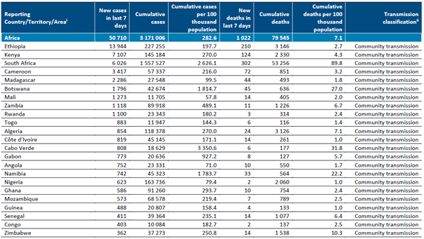 En yüksek sayıda yeni vaka bildiren ülkeler sırasıyla; Etiyopya (13.947 yeni vaka; 100.000 kişi başına 12,1 yeni vaka;% 4 azalma), Kenya (7107 yeni vaka; 100.000 kişi başına 13,2 yeni vaka;% 19 azalma) ve Güney Afrika (6026 yeni vaka; 100.000 kişi başına 10,2 yeni vaka; % 14 azalma) olmuştur.