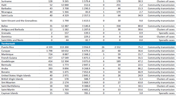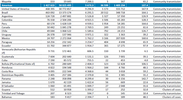 En çok ölüm vakalarının bildirildiği ülkeler yine; Brezilya (20.512 yeni ölüm; 100.000'de 9,7 yeni ölüm;% 3 azalma), Amerika Birleşik Devletleri (5173 yeni ölüm; 100.000'de 1,6 yeni ölüm; % 31 azalma) ve Meksika (3166 yeni ölüm; 100.000'de 2,5 yeni ölüm;% 6 artış) olmuştur.