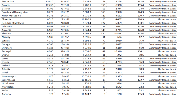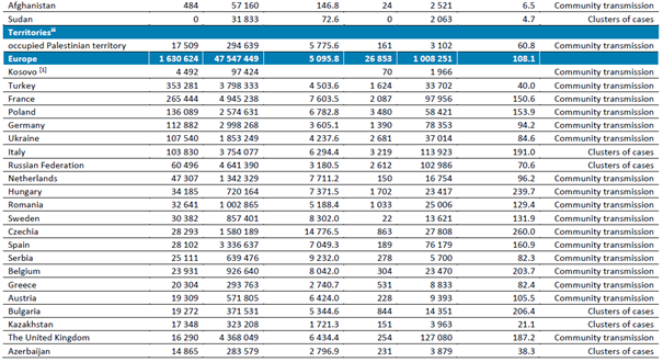 En çok ölüm vakası bildiren ülkeler; Polonya (3480 yeni ölüm; 100.000 kişi başına 9,2 yeni ölüm, % 14 artış), İtalya (3219 yeni ölüm; 100.000'de 5,4 yeni ölüm; %5 artış) ve Ukrayna (2681 yeni ölüm; 100.000 kişi başına 6,1 yeni ölüm,% 13 artış) olmuştur.