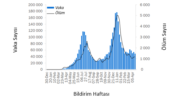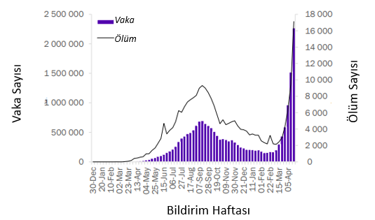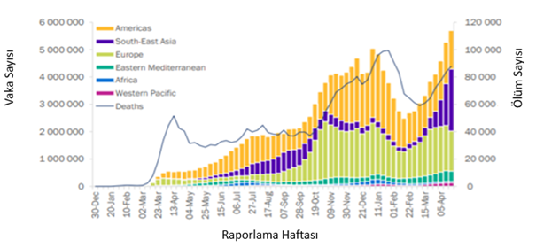 Küresel olarak, yeni COVID-19 vakaları art arda dokuzuncu haftada da artmış olup geçen hafta yaklaşık 5,7 milyon yeni vaka bildirilmiş ve önceden görülen piklerin üzeriine çıkılmıştır (Şekil 1). Yeni ölüm vakalarının sayısı art arda altıncı haftada da artarken, 87.000'den fazla yeni ölüm vakası bildirilmiiştir. Bu hafta, Güneydoğu Asya ve Batı Pasifik bölgeleri dışında tüm bölgeler vaka insidansında düşüşler bildirmektedir. Art arda üçüncü haftada, Güneydoğu Asya bölgesi hem vaka hem de ölüm vakası sayılarında en yüksek artışları bildirmiştir (Tablo 1). Bölgedeki bazı ülkeler vaka sayılarında yükselme eğilimleri göstermekte olup Hindistan bu bölgesel eğilimden gelen vakaların büyük çoğunluğunu ve geçen hafta bildirilen küresel vakaların % 38'ini oluşturmaktadır. Benzer şekilde, Güneydoğu Asya ve Doğu Akdeniz olmak üzere iki bölge hariç tümü, bu hafta yeni ölümlerde düşüşler bildirmiştir.