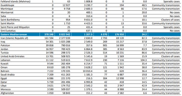 En çok yeni ölüm vakası bildiren ülkeler; İran (2793 yeni ölüm, 100.000 kişi başına 3,3 yeni ölüm,% 33 artış), Pakistan (905 yeni ölüm, 100.000'de 0,4 yeni ölüm, %18 artış ) ve Tunus (514 yeni ölüm, 100.000'de 4,3 yeni ölüm,% 7 artış) olmuştur.