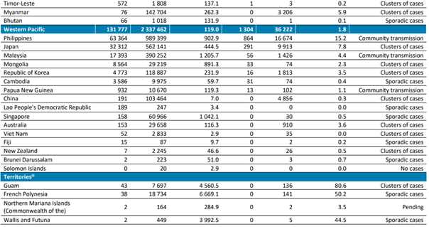 Batı Pasifik Bölgesi bir önceki haftaya göre 132.000 yeni vaka bildirmiş ve bir önceki haftaya göre % 3'lük bir artış yaşanmıştır. Ölüm oranlarında ise %10’luk düşüş yaşanmış olup 1300’den fazla yeni ölüm vakası bildirmiştir. Bölgede, art arda son yedi hafta içinde yeni vaka sayısında artış eğilimi gözlenirken ölüm vakalarında ise Nisan ayı başında görülen pik seviyenin ardından son iki haftadır düşüş eğilimi görülmüştür.