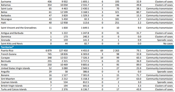 En çok ölüm vakalarının bildirildiği ülkeler yine; Brezilya (17.667 yeni ölüm; 100.000'de 8,3 yeni ölüm;% 12 azalma), Amerika Birleşik Devletleri (4951 yeni ölüm; 100.000'de 1,5 yeni ölüm; %4 azalma) ve Kolombiya (2882 yeni ölüm; 100.000'de 5,7 yeni ölüm;% 26 artış) olmuştur.