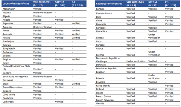 Suriye için VOC 202012/01 ve Uganda için 501Y.V2 varyantları, alınan daha fazla bilgiye göre bu hafta hariç tutulmuştur.