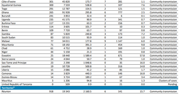 En yüksek sayıda yeni vaka bildiren ülkeler sırasıyla; Etiyopya (10.719 yeni vaka; 100.000 kişi başına 9,3 yeni vaka;% 17 azalma), Güney Afrika (8690 yeni vaka; 100.000 kişi başına 14,7 yeni vaka;% 7 artış) ve Kenya (5031 yeni vaka; 100.000 kişi başına 9,4 yeni vaka; % 18 azalma) olmuştur.