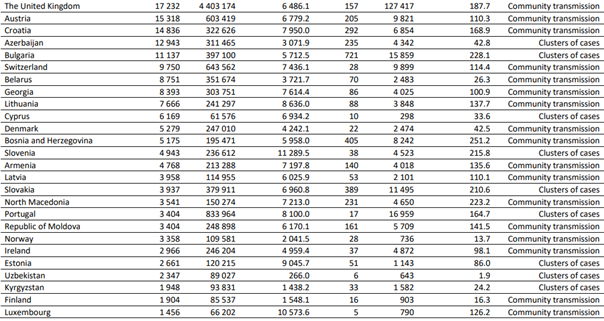 En çok ölüm vakası bildiren ülkeler; Polonya (3383 yeni ölüm; 100.000 kişi başına 8,9 yeni ölüm, % 6 azalma), Rusya (2650 yeni ölüm; 100.000'de 1,8 yeni ölüm; %2 artış) ve Ukrayna (2537 yeni ölüm; 100.000 kişi başına 5,8 yeni ölüm,% 8 azalma) olmuştur.