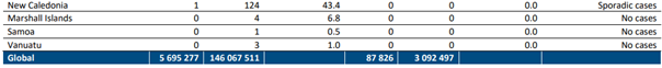 En çok yeni vaka bildiren üç ülke; Filipinler (63.364 yeni vaka; 100.000 başına 57,8 yeni vaka,% 13 azalma), Japonya (32.312 yeni vaka; 100.000 başına 25,5 yeni vaka,% 22 artış) ve Malezya (17.393 yeni vaka; 100.000 başına 53,7 yeni vaka, % 27 artış) olmuştur.
