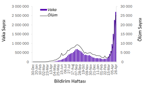 Art arda ikinci haftada da, küresel olarak COVID-19 vakalarının sayısı, art arda dokuz haftalık artışın ardından 5,7 milyondan fazla haftalık yeni vaka ile pandeminin başlangıcından bu yana en yüksek seviyelere ulaşmıştır (Şekil 1). Yeni ölüm vakaları art arda yedinci haftada da 93.000'den fazla ölüm vakasıyla artmaya devam etmektedir. Güneydoğu Asya Bölgesi, hem vaka hem de ölüm vakalarında belirgin artışlar rapor etmeye devam etmektedir (Tablo 1). Hindistan, bölgedeki hem vakaların hem de ölümlerin % 90'ından fazlasını, ayrıca geçen hafta rapor edilen küresel vakaların % 46'sını ve küresel ölümlerin % 25'ini oluşturmaktadır. Avrupa, Doğu Akdeniz, Afrika ve Amerika bölgelerinde vaka insidansı azalırken, Batı Pasifik Bölgesi'ndeki oranlar bir önceki haftayla karşılaştırılabilir düzeyde kalmıştır. Avrupa, Afrika ve Batı Pasifik bölgesinde ölüm vakası sayıları azalırken, Amerika ve Doğu Akdeniz bölgelerinde ölüm vakaları sayılarında hafif artışlar bildirilmiştir.