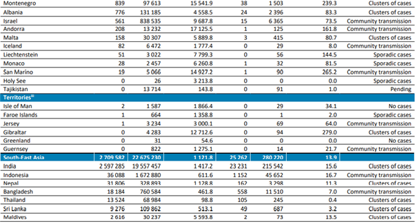 En çok yeni vaka bildiren üç ülke; İran (139.118 yeni vaka, 100.000 kişi başına 165,6 yeni vaka,% 14 azalma), Irak (45.078 yeni vaka, 100.000 kişi başına 112,1 yeni vaka,% 17 azalma) ve Pakistan (35.503 yeni vaka, 100.000 kişi başına 16,1 yeni vaka,% 11 azalma) olmuştur.