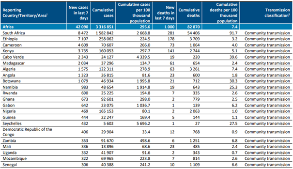 En yüksek sayıda yeni ölüm vakası bildiren ülkeler; Güney Afrika (281 yeni ölüm; 100.000'de 0,5 yeni ölüm;% 32 azalma), Etiyopya (178 yeni ölüm; 100.000’de 0,2 yeni ölüm; %12 azalma) ve Kenya (141 yeni ölüm; 100.000'de 0,3 yeni ölüm;% 1 artış) olmuştur.