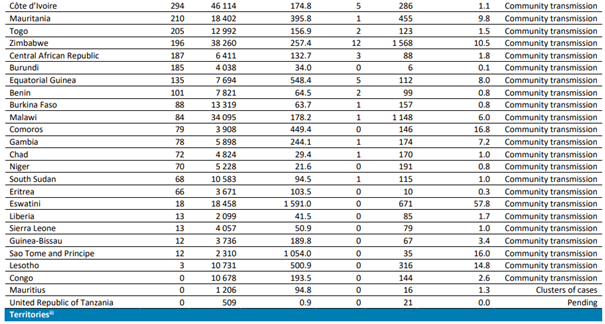 En yüksek sayıda yeni vaka bildiren ülkeler sırasıyla; Güney Afrika (8472 yeni vaka; 100.000 kişi başına 14,3 yeni vaka;% 3 azalma), Etiyopya (7107 yeni vaka; 100.000 kişi başına 6,2 yeni vaka;% 34 azalma) ve Kamerun (4609 yeni vaka; 100.000 kişi başına 17,4 yeni vaka; % 8 artış) olmuştur.