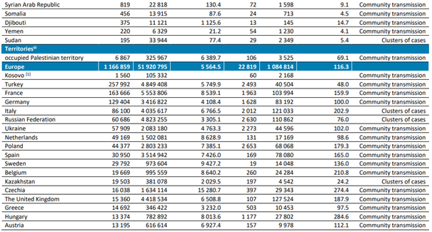 En fazla yeni vaka bildiren üç ülke; Türkiye (257.992 yeni vaka; 100.000 kişi başına 305,9 yeni vaka,% 32 azalma), Fransa (163.666 yeni vaka, 100.000 kişi başına 251,6 yeni vaka,% 23 azalma) ve Almanya ( 129.904 yeni vaka, 100.000 kişi başına 155,6 yeni vaka,% 11 azalma) olmuştur.