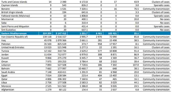 En çok yeni ölüm vakası bildiren ülkeler; İran (2970 yeni ölüm, 100.000 kişi başına 3,5 yeni ölüm,% 6 artış), Pakistan (958 yeni ölüm, 100.000'de 0,4 yeni ölüm, %6 artış ) ve Tunus (577 yeni ölüm, 100.000'de 4,9 yeni ölüm,% 12 artış) olmuştur.