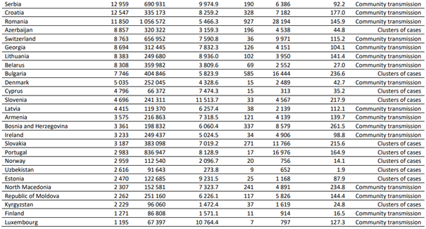 En çok ölüm vakası bildiren ülkeler; Polonya (2653 yeni ölüm; 100.000 kişi başına 7,0 yeni ölüm, % 22 azalma), Rusya (2630 yeni ölüm; 100.000'de 1,8 yeni ölüm; %1 azalma) ve Türkiye (2493 yeni ölüm; 100.000 kişi başına 3,0 yeni ölüm,% 4 artış) olmuştur.
