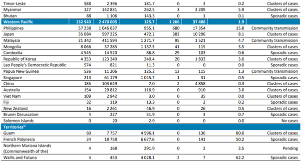 Batı Pasifik Bölgesi bir önceki haftaya göre 132.000’den fazla yeni vaka bildirmiş ve bir önceki haftaya göre % 1'lik bir artış yaşanmıştır. Ölüm oranlarında ise %3’lük düşüş yaşanmış olup 1200’den fazla yeni ölüm vakası bildirmiştir. Bölge, art arda son sekiz haftadır yeni vaka sayısında artış eğilimini sürdürürken ölüm vakalarında ise art arda üç haftadır düşüş eğilimi göstermiştir.