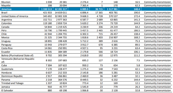 Amerika Bölgesinde 1.3 milyondan fazla yeni vaka ve 36.000'den fazla yeni ölüm bildirilmiş olup bir önceki haftaya göre vaka sayılarında % 5'lik bir düşüş ölüm oranında ise % 1’lik bir artış olmuştur. Vaka insidansı art arda iki haftadır azalma eğilimi göstermiştir. En çok yeni vaka bildiren ülkeler; Brezilya (421.933 yeni vaka; 100.000 nüfus başına 198,5 yeni vaka;% 4 artış), Amerika Birleşik Devletleri (345.692 yeni vaka; 100.000 başına 104,4 yeni vaka; % 15 azalma) ve Arjantin (152.711 yeni vaka; 100.000 başına 337,9 yeni vaka;% 8 azalma) olmuştur. Bu üç ülke, bu hafta bölgede bildirilen vakaların% 69'unu oluşturmaktadır.