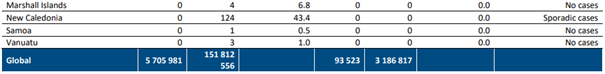 En çok yeni vaka bildiren üç ülke; Filipinler (57.238 yeni vaka; 100.000 başına 52,2 yeni vaka,% 10 azalma), Japonya (35.084 yeni vaka; 100.000 başına 27,7 yeni vaka,% 9 artış) ve Malezya (21.342 yeni vaka; 100.000 başına 65,9 yeni vaka, % 23 artış) olmuştur.