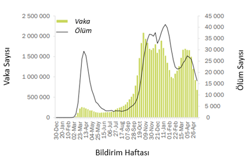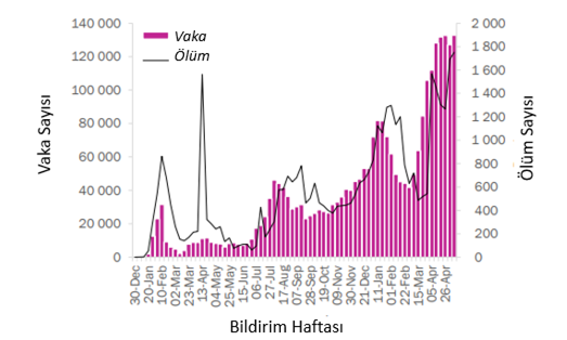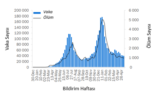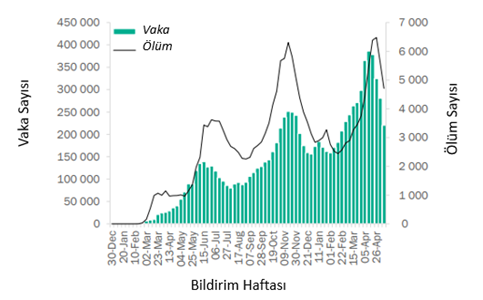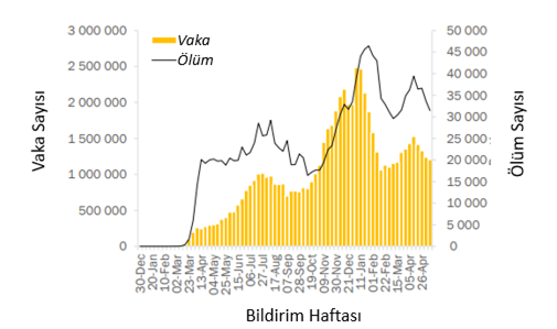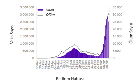 Yeni vaka ve ölüm sayılarında azalma devam etmiş olup bir önceki haftaya göre sırasıyla % 12 ve % 5'lik düşüş görülmüştür. Son üç haftadır düşüş eğilimine rağmen, vaka insidansı, pandeminin başlamasından bu yana görülen en yüksek seviyelerden biridir