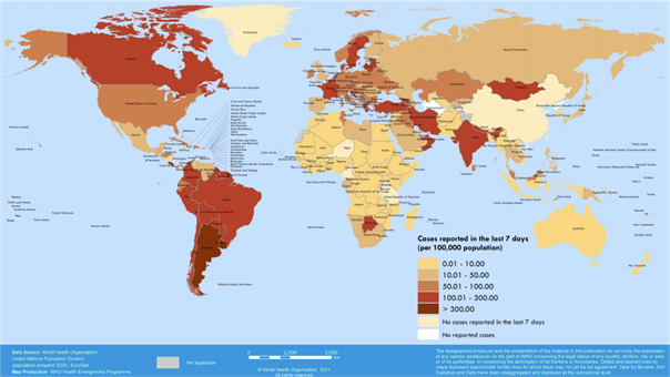 Şekil 2. Ülkelere ve bölgelere göre, son yedi günde 100.000 nüfus başına bildirilen COVID-19 vakası, 10 – 116 Mayıs 2021 **