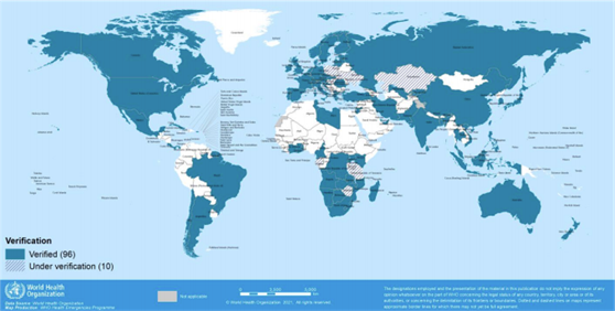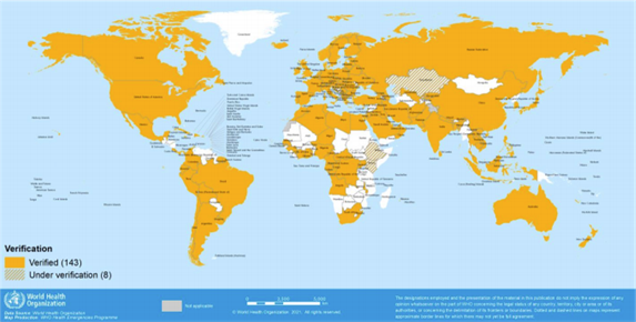 - (Aktif) vaka yok: Sağlam bir sürveyans sistemi varlığında en az 28 gün (maksimum inkübasyon süresinin iki katı) yeni vaka tespit edilmemiş olmasıdır. Genel nüfus için sıfıra yakın bir enfeksiyon riski anlamına gelmektedir.