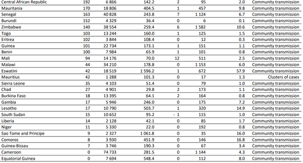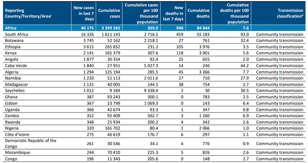 En yüksek sayıda yeni vaka bildiren ülkeler sırasıyla; Güney Afrika (16.326 yeni vaka; 100.000 kişi başına 27,5 yeni vaka;% 36 artış), Botsvana (3745 yeni vaka; 100.000 kişi başına 159,3 yeni vaka;% 153 artış) ve Etiyopya (3615 yeni vaka; 100.000 kişi başına 3,1 yeni vaka; % 13 azalma) olmuştur. Güney Afrika'daki vaka sayıları, bölgede bildirilen vakaların % 41'ini oluşturmaktadır.