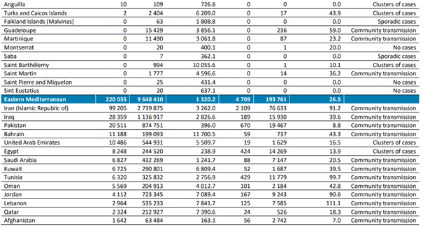En çok yeni ölüm vakası bildiren ülkeler; İran (2109 yeni ölüm, 100.000 kişi başına 2,5 yeni ölüm,% 13 azalma), Pakistan (670 yeni ölüm, 100.000'de 0,3 yeni ölüm, %20 azalma ) ve Tunus (429 yeni ölüm, 100.000'de 3,6 yeni ölüm,% 21 azalma) olmuştur.