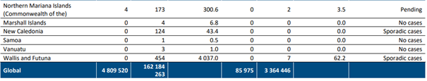 En çok yeni vaka bildiren üç ülke; Japonya (44.961 yeni vaka; 100.000 başına 35,5 yeni vaka,% 26 artış), Filipinler (43.339 yeni vaka; 100.000 başına 39,5 yeni vaka,% 10 azalma) ve Malezya (29.386 yeni vaka; 100.000 başına 90,8 yeni vaka, % 16 artış) olmuştur. Bu üç ülke, geçen hafta Bölge'de bildirilen tüm vakaların% 89'unu oluşturmuştur.