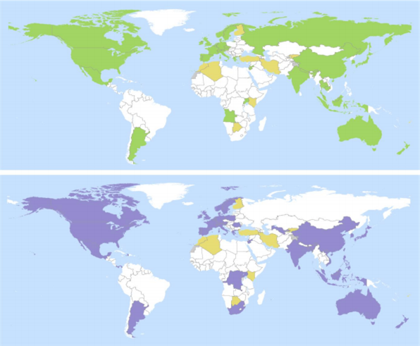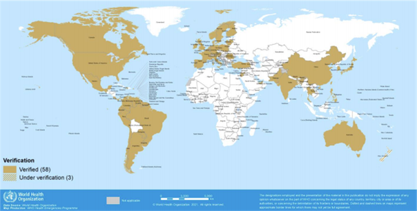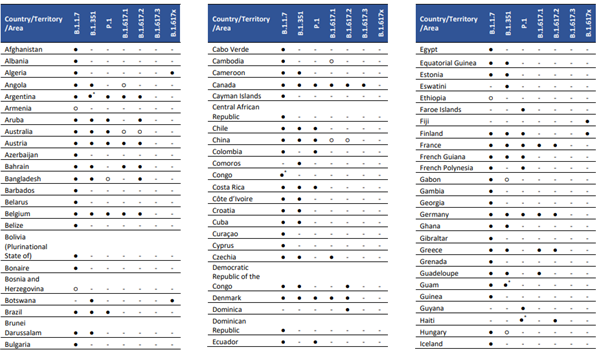 SARS CoV-2 varyantlarını tespit etmeye yönelik sürveyans faaliyetleri, stratejik genomik sekanslama da dahil olmak üzere yerel ve ulusal düzeylerde güçlendirildikçe, VOC'leri ve VOI'leri bildiren ülke / bölge / bölge (bundan sonra ülkeler olarak anılacaktır) sayısı artmaya devam etmiştir (Şekil 3-6, Ek 2). Bu dağılım, ülkeler arasındaki sekanslama kapasiteleri ve örnekleme stratejilerindeki farklılıklar dahil olmak üzere, sürveyans sınırlamaları dikkate alınarak yorumlanmalıdır.