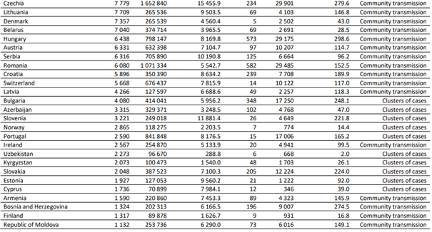 En çok ölüm vakası bildiren ülkeler; Rusya (2545 yeni ölüm; 100.000 kişi başına 1,7 yeni ölüm, % 3 artış), Türkiye (1791 yeni ölüm; 100.000'de 2,1 yeni ölüm; %20 azalma) ve Ukrayna (1682 yeni ölüm; 100.000 kişi başına 3,8 yeni ölüm,% 6 azalma) olmuştur.