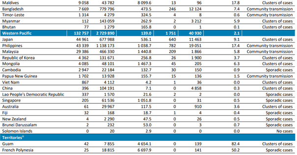 Batı Pasifik Bölgesi 132.000’den fazla yeni vaka bildirmiş ve bir önceki haftaya göre % 4'lük bir artış yaşanmıştır. Ölüm oranlarında ise yine %4’lük artış yaşanmış olup 1700’den fazla yeni ölüm vakası bildirmiştir. Hem haftalık vaka sayıları hem de ölüm vakaları, pandeminin başlangıcından bu yana Bölge'de bildirilen en yüksek vaka insidansını göstermiştir.