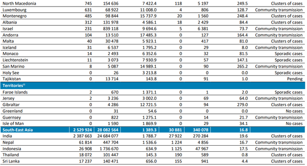 Güneydoğu Asya bölgesi, bir önceki haftaya göre % 12’lik düşüşle 2.5 milyondan fazla yeni vaka, ölüm oranlarında ise %7'lik bir artışla 30.000’den fazla yeni ölüm vakası bildirmiştir. Mutlak sayı, pandeminin başlangıcından bu yana en yüksek seviyesinde kalmasına rağmen, art arda dokuz haftalık artıştan sonra vaka insidansı azalmıştır. Ölüm vaka sayıları ise art arda dokuz haftadır artmaya devam etmiştir. En çok yeni vaka bildiren üç ülke; Hindistan (2.387.663 yeni vaka; 100.000'de 173,0 yeni vaka;% 13 azalma), Nepal (61.814 yeni vaka; 100.000'de 212,2 yeni vaka; %8 artış) ve Endonezya (26.908 yeni vaka; 100.000 başına 9,8 yeni vaka;% 27 azalma) olmuştur.