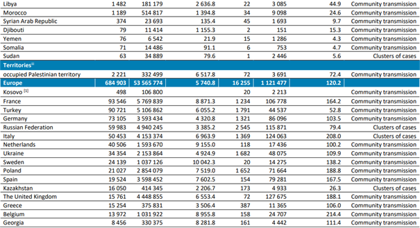 En fazla yeni vaka bildiren üç ülke; Fransa (93.546 yeni vaka; 100.000 kişi başına 143,8 yeni vaka,% 24 azalma), Türkiye (90.721 yeni vaka, 100.000 kişi başına 107,6 yeni vaka,% 46 azalma) ve Almanya ( 73.105 yeni vaka, 100.000 kişi başına 87,9 yeni vaka,% 29 azalma) olmuştur.