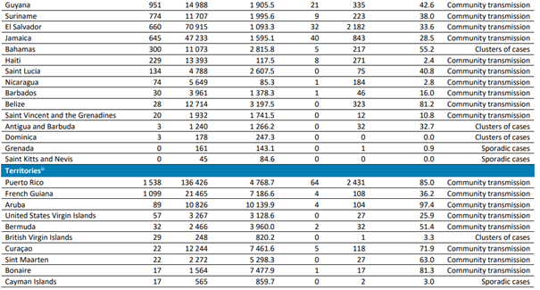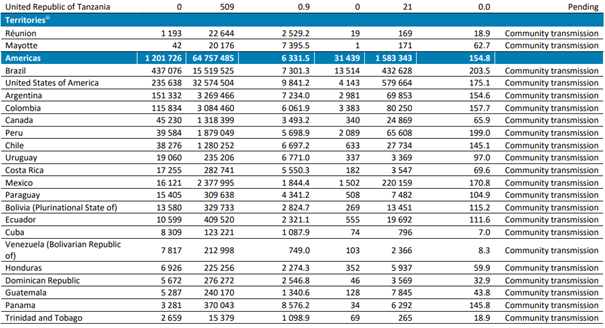 En çok ölüm vakalarının bildirildiği ülkeler yine; Brezilya (13.514 yeni ölüm; 100.000'de 6,4 yeni ölüm;% 12 azalma), Amerika Birleşik Devletleri (4143 yeni ölüm; 100.000'de 1,3 yeni ölüm; %12 azalma) ve Kolombiya (3383 yeni ölüm; 100.000'de 6,6 yeni ölüm;% 8 artış) olmuştur.