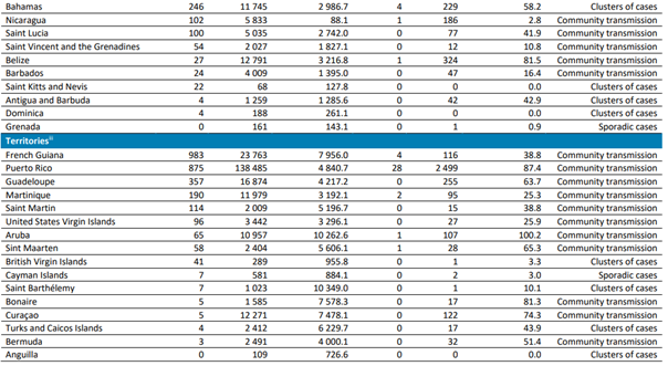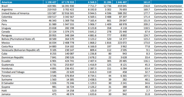 En çok ölüm vakalarının bildirildiği ülkeler yine; Brezilya (12.736 yeni ölüm; 100.000'de 6,0 yeni ölüm; %7 azalma), Amerika Birleşik Devletleri (4596 yeni ölüm; 100.000'de 1,4 yeni ölüm; %14 artış) ve Kolombiya (3488 yeni ölüm; 100.000'de 6,9 yeni ölüm; yüzde oranı bir önceki haftaya benzer) olmuştur.