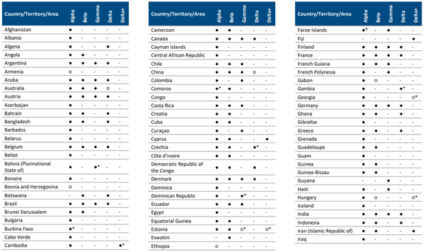 " o " ifadesi, bu varyant için bilgilerin DSÖ tarafından resmi olmayan kaynaklardan alındığını ve daha fazla bilgi elde edildikçe inceleneceğini belirtir. Bangladeş için Gamma ve Panama için Delta varyantları, alınan daha fazla bilgiye dayanarak bu hafta hariç tutulmuştur.