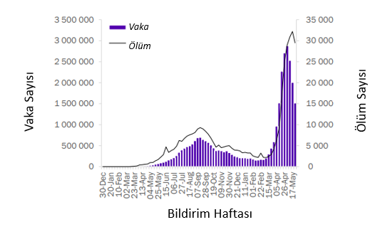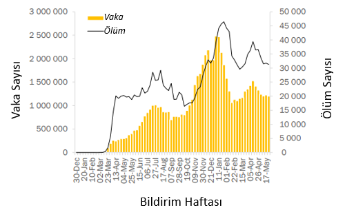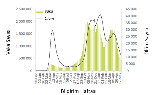 Geçen hafta küresel olarak bildirilen 3,5 milyondan fazla yeni vaka ve 78.000 yeni ölüm vakasıyla birlikte yeni COVID-19 vakaları ve ölümlerinin sayısı azalmaya devam etmekte olup bir önceki haftaya göre sırasıyla %15'lik ve %7'lik bir azalma gerçekleşmiştir (Şekil 1). Avrupa ve Güneydoğu Asya Bölgeleri, geçen hafta yeni vaka ve ölümlerde en büyük düşüşü bildirirken, Afrika ve Batı Pasifik bölgelerinde vaka insidansı artmıştır (Tablo 1).