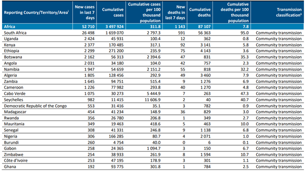 En yüksek sayıda yeni ölüm vakası bildiren ülkeler; Güney Afrika (591 yeni ölüm; 100.000'de 1,0 yeni ölüm; yüzde oranı bir önceki haftaya benzer), Kenya (92 yeni ölüm; 100.000’de 0,2 yeni ölüm; %92 artış) ve Etiyopya (75 yeni ölüm; 100.000'de 0,1 yeni ölüm;% 18 azalma) olmuştur.