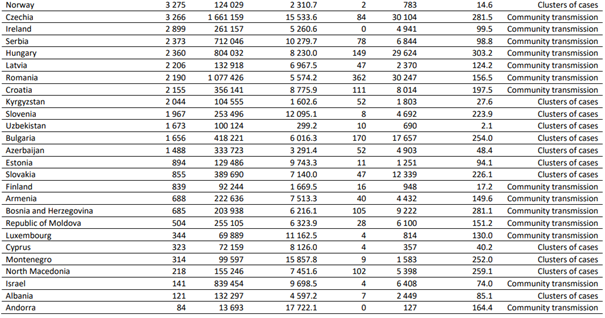 En çok ölüm vakası bildiren ülkeler; Rusya (2680 yeni ölüm; 100.000 kişi başına 1,8 yeni ölüm, % 3 artış), Türkiye (1200 yeni ölüm; 100.000'de 1,4 yeni ölüm; %22 azalma) ve Ukrayna (1104 yeni ölüm; 100.000 kişi başına 2,5 yeni ölüm,% 15 azalma) olmuştur.