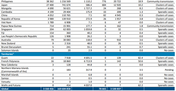 Amerika ve Doğu Akdeniz Bölgeleri tarafından bildirilen vaka sayılarıyla önceki hafta bildirilen vaka sayılarla benzerlik görülmektedir. Afrika Bölgesi'nde ölüm insidansında bir artış rapor edilirken, Avrupa ve Doğu Akdeniz Bölgelerinde düşüşler rapor edilmiş ve Batı Pasifik ve Amerika Bölgelerinde bildirilen ölüm insidansıyla önceki haftadanın ölüm insidansıyla benzerlik görülmüştür. Küresel vaka ve ölüm sayısı art arda beşinci ve dördüncü haftada azalmaya devam etse de, vaka ve ölüm insidansları yüksek seviyelerde kalmaya devam etmekte ve tüm bölgelerde birçok ülkede önemli artışlar rapor edilmektedir.