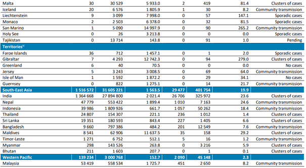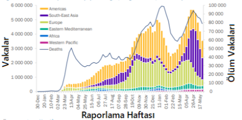 Avrupa ve Güneydoğu Asya Bölgeleri, geçen hafta yeni vaka ve ölümlerde en büyük düşüşü bildirirken, Afrika ve Batı Pasifik bölgelerinde vaka insidansı artmıştır. Amerika ve Doğu Akdeniz Bölgeleri tarafından bildirilen vaka sayılarıyla önceki hafta bildirilen vaka sayılarla benzerlik görülmektedir.