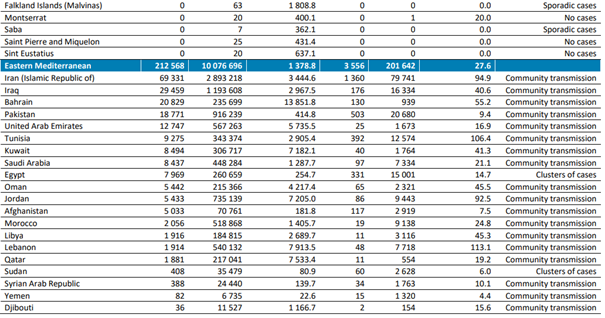En çok yeni ölüm vakası bildiren ülkeler; İran (1360 yeni ölüm, 100.000 kişi başına 1,6 yeni ölüm,% 22 azalma), Pakistan (503 yeni ölüm, 100.000'de 0,2 yeni ölüm, %29 azalma ) ve Tunus (392 yeni ölüm, 100.000'de 3,3 yeni ölüm,% 3 azalma) olmuştur.