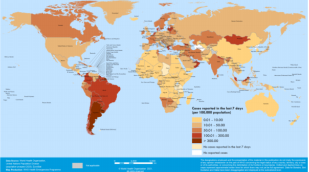 Şekil 2. Ülkelere ve bölgelere göre, son yedi günde 100.000 nüfus başına bildirilen COVID-19 vakası, 24 – 30 Mayıs 2021 **
