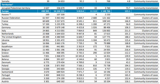 En fazla yeni vaka bildiren üç ülke; Rusya (61.937 yeni vaka; 100.000 kişi başına 42,4 yeni vaka, yüzde oranı bir önceki haftaya benzer), Fransa (60.600 yeni vaka, 100.000 kişi başına 93,2 yeni vaka,% 26 azalma) ve Türkiye ( 57.330 yeni vaka, 100.000 kişi başına 68,0 yeni vaka,% 20 azalma) olmuştur.