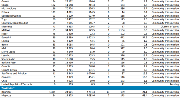 En yüksek sayıda yeni vaka bildiren ülkeler sırasıyla; Güney Afrika (26.498 yeni vaka; 100.000 kişi başına 44,7 yeni vaka;% 24 artış), Uganda (2424 yeni vaka; 100.000 kişi başına 5,3 yeni vaka;% 191 artış) ve Kenya (2377 yeni vaka; 100.000 kişi başına 4,4 yeni vaka; % 13 azalma) olmuştur.