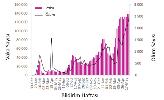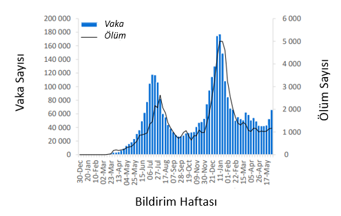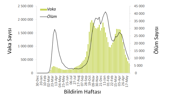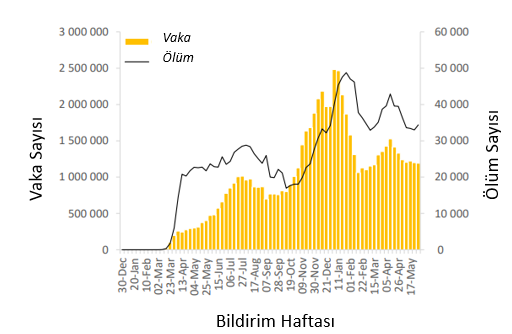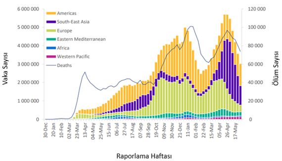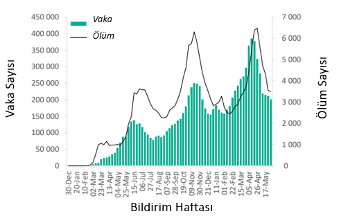 Küresel vaka ve ölüm insidansları, haftalık 3 milyondan fazla yeni vaka ve 73.000'den fazla yeni ölüm ile yeni vaka ve ölüm vakalarının sayısı azalmaya devam etmiştir; bir önceki haftaya göre sırasıyla % 15'lik ve % 8'lik bir düşüş gerçekleşmiştir (Şekil 1). Avrupa Bölgesi ve Güneydoğu Asya Bölgesi son bir haftada yeni vaka sayısında belirgin düşüşler olduğunu bildirirken, Afrika Bölgesi yeni vaka sayılarında bir önceki haftaya göre artış olduğunu bildirmiştir (Tablo 1). Amerika, Doğu Akdeniz ve Batı Pasifik Bölgeleri tarafından bildirilen vaka sayıları, önceki hafta bildirimlerine benzer şekilde gerçekleşmiştir. Geçen hafta rapor edilen yeni ölümlerin sayısı Avrupa ve Güneydoğu Asya Bölgelerinde düşerken Batı Pasifik Bölgesi'nde artmıştır. Doğu Akdeniz ve Afrika Bölgelerinin yanı sıra Amerika Bölgesi'nde de ölüm vakaları insidansı sabit kalmıştır. Sırasıyla, art arda son altı ve beş haftadır küresel vaka ve ölüm vakalarındaki düşüş eğilimine rağmen, altı bölgenin tamamındaki birçok ülke, vaka ve ölüm sayılarında artış gözlendiğini bildirmiştir.