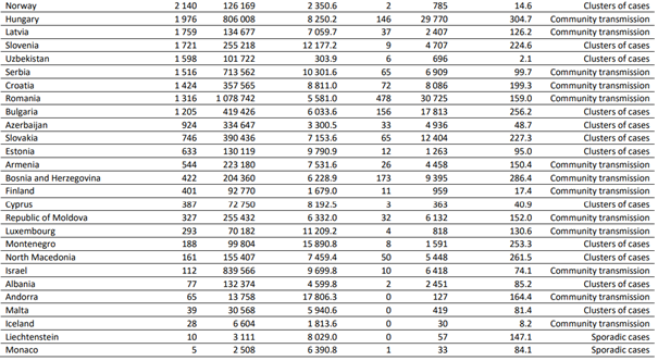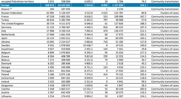 En çok ölüm vakası bildiren ülkeler; Rusya (2625 yeni ölüm; 100.000 kişi başına 1,8 yeni ölüm, yüzde oranı bir önceki haftaya benzer), Almanya (816 yeni ölüm; 100.000'de 1,0 yeni ölüm; %20 azalma) ve Türkiye (797 yeni ölüm; 100.000 kişi başına 0,9 yeni ölüm,% 34 azalma) olmuştur.