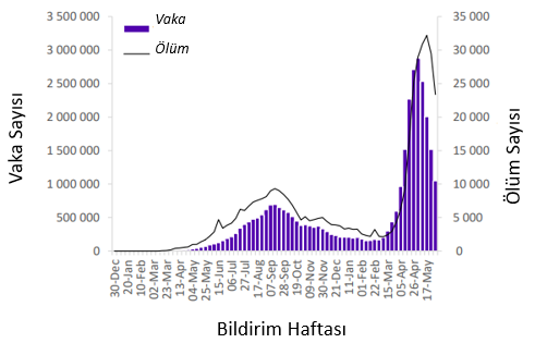 Küresel vaka ve ölüm insidansları, haftalık 3 milyondan fazla yeni vaka ve 73.000'den fazla yeni ölüm ile yeni vaka ve ölüm vakalarının sayısı azalmaya devam etmiştir; bir önceki haftaya göre sırasıyla % 15'lik ve % 8'lik bir düşüş gerçekleşmiştir.